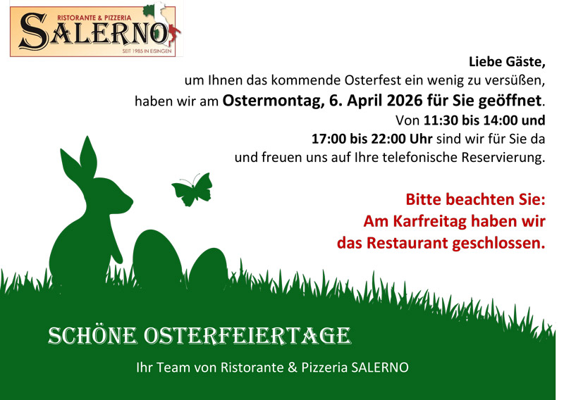 Das Team von Salerno freut sich sehr auf Ihren Besuch und bittet um eine jeweilige Vorreservierung, um Wartezeiten für Sie zu vermeiden!